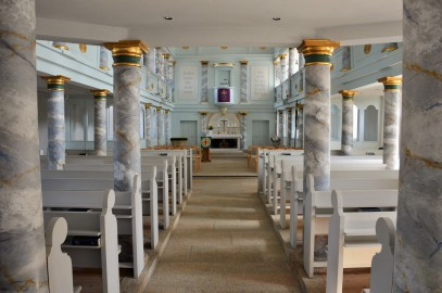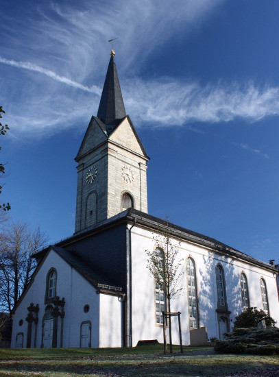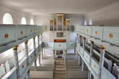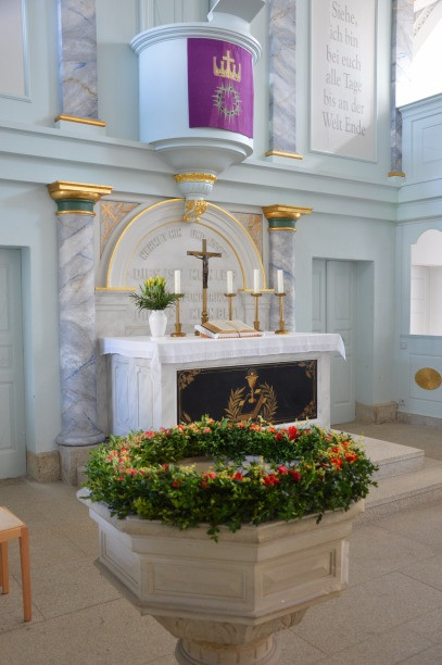 Freundlich, sympathisch und einladend zeigt sich unsere Kirche nach der umfassenden Sanierung zu Beginn der "0-er" Jahre. Der helle lichte Innenraum - konzipiert als Saalbau - mit seinen Prinzipalstücken Kanzelaltar und Taufstein wirkt - im klassizistischen Stil gehalten - leicht und trotzdem konzentriert. Der Prospekt unserer zweimanualigen Heidenreich-Orgel fügt sich harmonisch mit in das Gesamtbild ein.